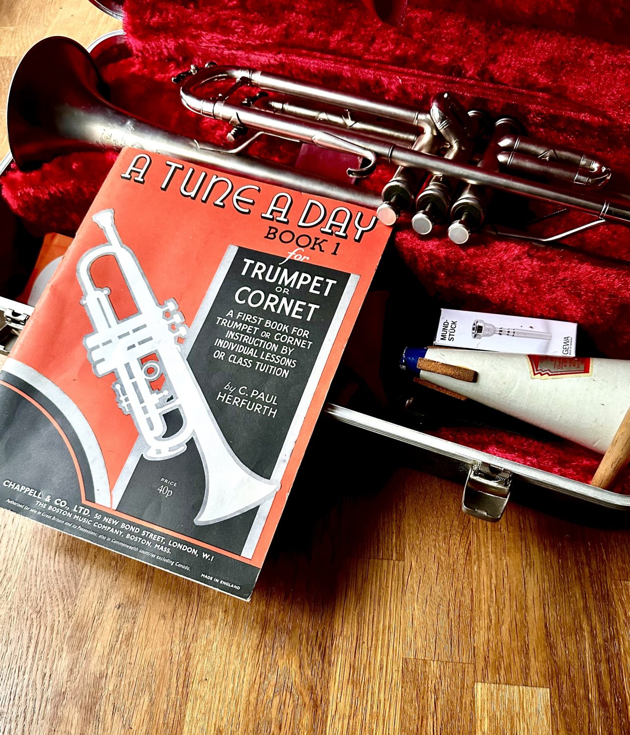 No matter. I had a trumpet in my hands now, so next thing was – find out how to play it. This I did by trial and error, but my parents had also provided me with a book: “A Tune A Day for Trumpet or Cornet”. This helped a lot. Pretty soon, I could play many tunes-a-day, and I thought I was very good. Don’t forget, I’d been having piano lessons since I was three, and I played the cello too. This trumpet was an add-on to all that. I thought I could master it without too much trouble.